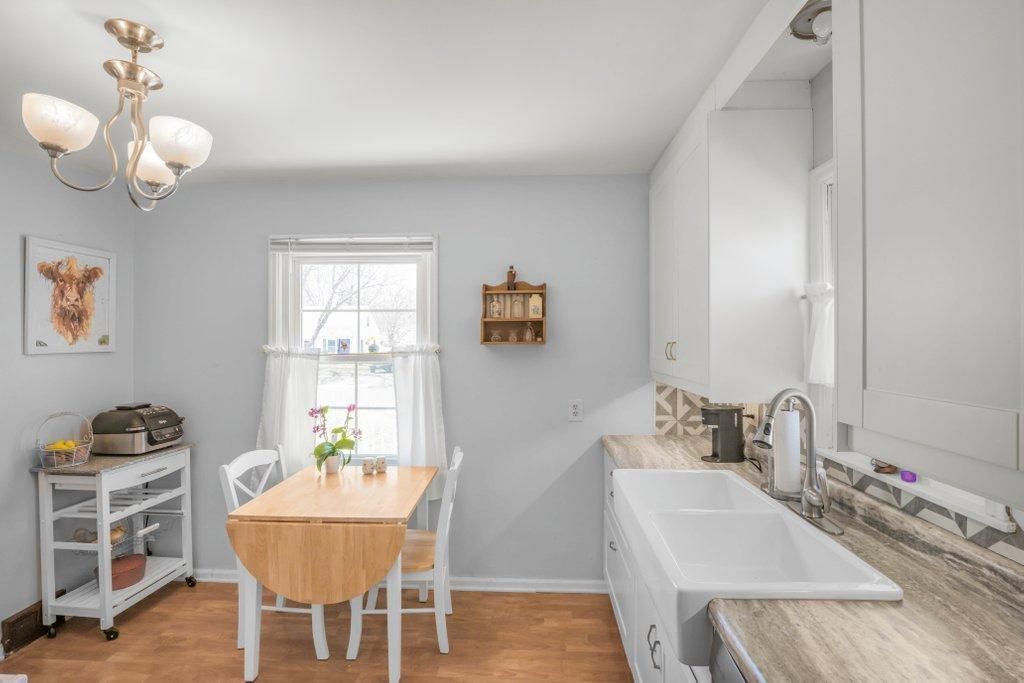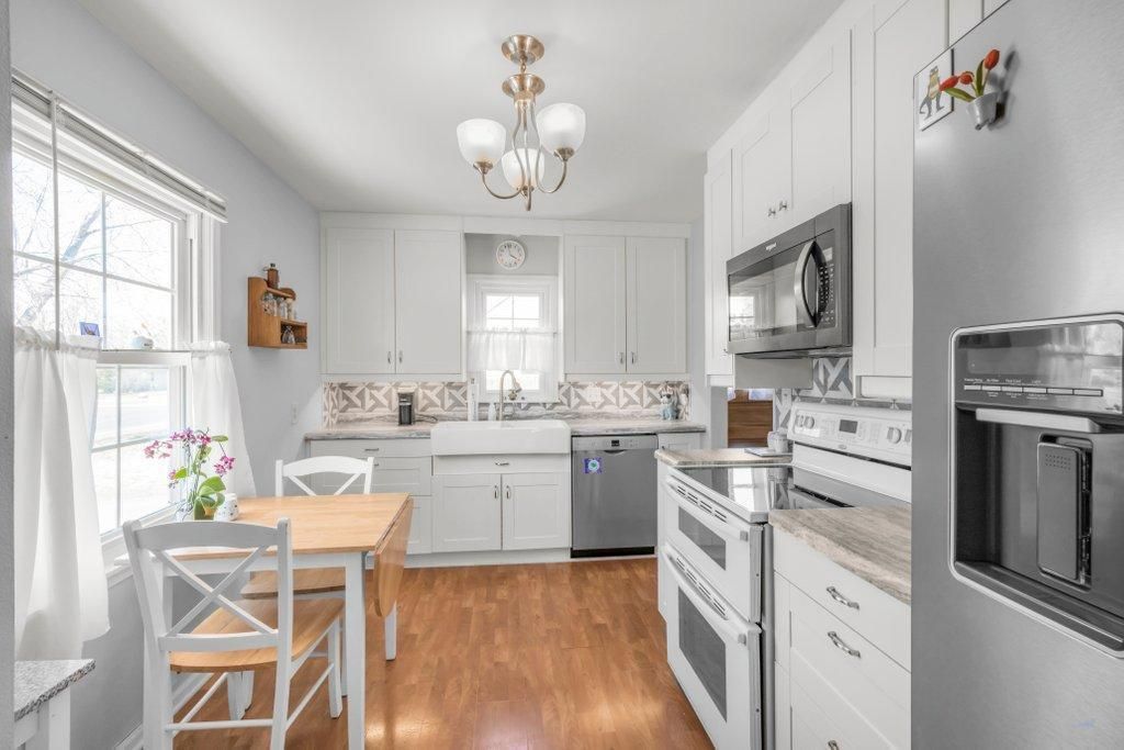 Charming rambler featuring a great layout for everyday living and entertaining, complete with a spacious, detached two-car garage. The updated kitchen offers white cabinetry extending to the ceiling for additional storage, updated appliances, and a farmhouse-style sink.The living room is highlighted by a large picture window that fills the space with natural light. Just off the dining area, a sliding glass door provides direct access to the deck and a spacious, fully fenced backyard?ideal for outdoor use, pets, or play.Thoughtful updates over time include newer mechanicals?furnace and central air?as well as replaced windows, offering added comfort and efficiency. The main-level bathroom features a walk-in shower with a stone-pattern surround.The finished lower level offers additional living space with cozy carpeting, a sliding barn door, and the option for a second bedroom with a full egress window.