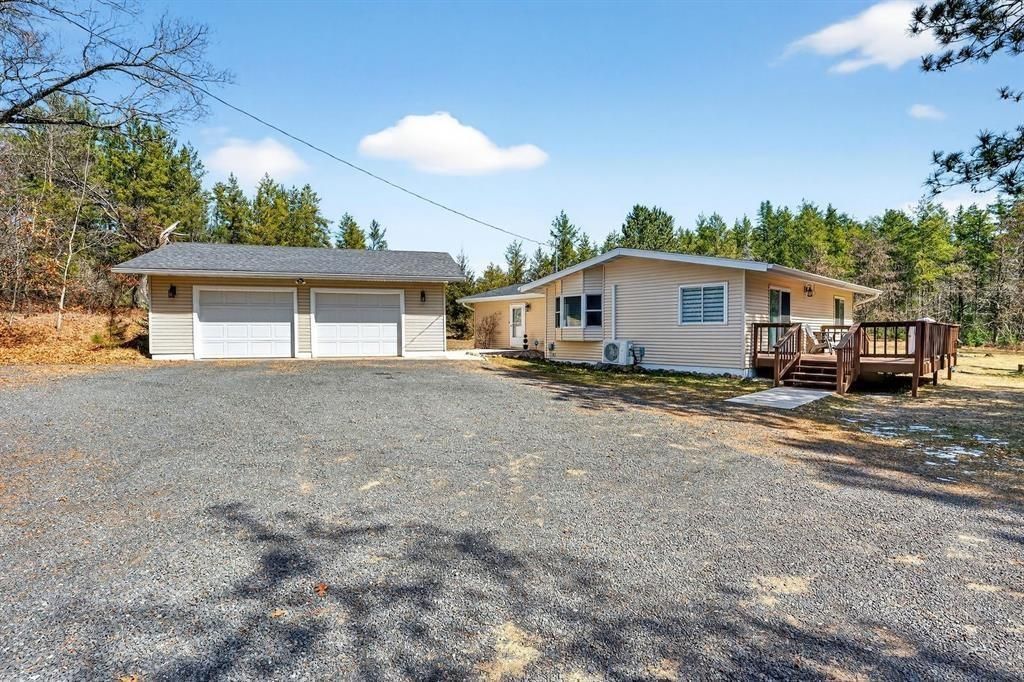 Set on 2 acres just 10 minutes north of Spooner, this 4 BR/2 BA home offers a great country setting with a convenient location. The home is immaculate and move-in ready, featuring a welcoming entry and a comfortable layout. The living room offers a vaulted ceiling and a warm, inviting feel, while the interior is tastefully updated with a nice balance of knotty pine and painted finishes for a clean, modern Northwoods look. Updated light fixtures, newer appliances, flooring, kitchen remodel, and several other thoughtful improvements throughout make this home easy to step into and enjoy. All four bedrooms, including a primary suite, are on the main level. The fourth bedroom is currently used as a bedroom but would also make a great home office. The lower level is unfinished but clean and very usable, offering excellent storage or future finishing potential. Outside, the property includes a 2 car garage, maintenance-free siding, a deck for relaxing or grilling, and a fenced garden area. Located near ATV and snowmobile trails, lakes, the Namekagon River, and county land, this property offers easy access to year round recreation.